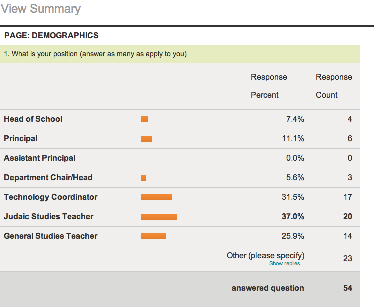 We are teachers, technology coordinators, administrators, and more. 37% of us are Judaic studies teachers, 25.9% of us are general studies teachers, and 5.6% of us are department chairs. 31.5% of us are technology coordinators and there are a number of technology directors as well. 11.1% of us are principals and 7.4% of us are heads of school. Also included among our members are a school board president, the Director of Educational Leadership at a Board of Jewish Education, a curriculum writer, student programming directors and coordinators, a parent, a religious school director, and a learning strategist.